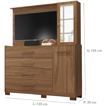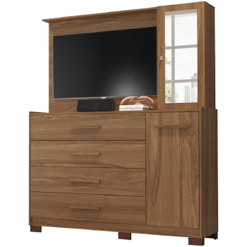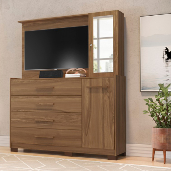 A Cômoda Ilhabela é um produto funcional, possui 04 gavetas com corrediças telescópicas, 02 portas com prateleiras internas, painel para TV de até 43 polegadas, porta superior com chave, puxadores em MDF revestidos.