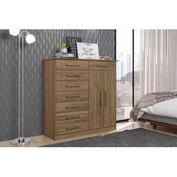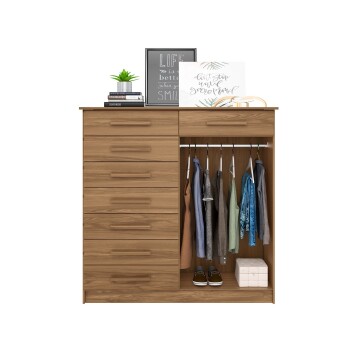 Produto compacto com 08 gavetas, 02 portas de bater e cabideiro, puxadores em MDF revestidos. Ideal para ambientes reduzidos.