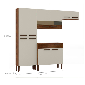 A Cozinha Nala é produzida com madeira reconstituída provinda de reservas florestais para este fim. Possui oito portas sendo uma com vidro reflecta que destaca a peça em seu ambiente, Os puxadores são ergonômicos em plástico resistente (poliestireno) com acabamento metalizado, mais beleza para sua cozinha. Oito pés reguláveis em plástico resistente (polipropileno) garantem a estabilidade do produto, podendo-se fazer pequenes ajustes na montagem, para o produto se adequar em pisos irregulares. O espaço interno é bem dividido com a utilização de prateleiras, para melhor organizar dos utensílios da cozinha. Todos os processos com secagem em luzes UV deixando o móvel mais bonito trazendo modernidade a sua cozinha.