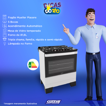 O novo fogão Piacere Vetro 5 bocas oferece elegância, desempenho e segurança para sua cozinha. A mesa de vidro temperado com grades de ferro fundido trazem modernidade e segurança ao cozinhar. Com acendimento automático e diferentes tipos de queimadores, ainda possui um queimador central de tripla chama onde você prepara rapidamente os mais variados pratos. O forno com acabamento total clean ainda possui duas grades com alturas ajustáveis.
