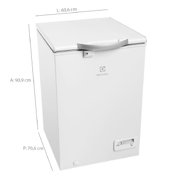 Descrição Características do Produto O Freezer Horizontal 149 Litros 1 TampaElectrolux tem o tamanho ideal para armazenar com economia. 149 litros de capacidade Alta capacidade para armazenamento de peças grandes sem abrir mão de mais espaço na sua cozinha. Classificação Energética A Baixo consumo de energia Puxador externo ergonômico Melhor encaixe da mão para abertura do freezer. Cesto aramado Ajuda na organização dos alimentos mais delicados. Controle de temperatura frontal e chave de segurança Controlar de forma prática a temperatura do congelador, o que é alterado a todo momento, e chave para controlar quem vai poder abrí-lo. Especificações Técnicas Capacidade líquida de armazenamento (L) Freezer: 149 Total: 149 Dados INMETRO Potência total de cons. (W) 127V/60 hz: 107,6W Potência total de cons. (W) 220V/60hz: 107,3W Corrente (A) 127V: 1,14A Corrente (A) 220V: 0,8A Peso do produto líquido (kg) 127 V: 3 Peso do produto líquido (kg) 220V: 37 Frequência (HZ): 60 Classificação energética: A Consumo de energia kWh/mês 127V: 26,6 220V: 26,6 Dimensões Produto embalado Altura: 95,5 cm Largura: 65,0 cm Profundidade: 75,0 cm
