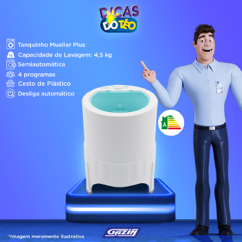 Descrição A Lavadora de Roupas 4,5Kg Mueller Plus garante eficiência para lavar até 4,5 kg de roupas. Possui timer manual com 3 programas que indicam as peças adequadas e o tempo de lavagem. Seu sistema de lavagem por agitação é muito eficiente na lavagem das roupas muito sujas. Sua peneira para pequenos objetos impede que moedas e botões sejam escoados junto com a água. A Plus possui classificação A pelo Inmetro e selo Procel, de produto que consome menos energia, comprovando