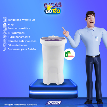 Descrição Lavadora de Roupas 4Kg Wanke Lis Tankinho Lis é compacta, eficiente, versátil e econômica, além de contar com um design moderno e a garantia da qualidade dos produtos Wanke. Dispenser para sabão e retentor de fiapos removível em peça única. Esfregador resistente e mais fácil para limpar. Pedestal removível. Turbina no fundo do produto. Carga máxima (roupa seca): 4 kg. Classe de eficiência PROCEL: A. Consumo de água por ciclo: 80 litros - ciclo. Consumo de energia por ciclo: 0,07 kWh. Eficiência de lavagem: 35 min. Tensão de alimentação - Frequência: 127 V ou 220V - 60 Hz. Timer: 35 min. Consumo de água por kg de roupa: 20 litros. Consumo de energia por kg: 0,018 kWh.