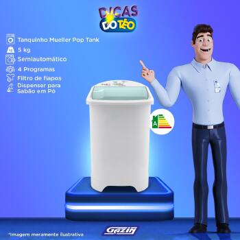 Descrição A Lavadora de Roupas 5Kg Mueller Pop Tank ganhou novo design, maior capacidade e ficou mais modernaa. Com capacidade para lavar até 5kg de roupa seca, possui lavagem por turbilhonamento, filtragem de fiapos por coluna dacute;água (exclusividade), esfregador com apoio para sabão e classificação A no Inmetro. Tudo isso para que você tenha roupas limpas com toda praticidade e eficiência que sua família merece! Características: Novo design que valoriza a lavanderia 4 programas diferentes para uma melhor lavagem Mangueira de entrada de água: pode ser instalada direto na torneira Tampa transparente: permite acompanhar a lavagem Dispenser para sabão em pó: evita desperdícios e manchas nas roupas Engates inteligentes: permitem a fixação da mangueira de escoamento em ambos os lados Esfregador com apoio para sabão Grande capacidade de lavagem, lava até 5Kg de roupa Lavagem por turbilhonamento Sistema Pop Filter: Filtro de fiapos por coluna d#39;água, roupas limpas e sem fiapos Tensão: 127/220V Potência: 127V - 450W/220V - 388W Capacidade de água na cuba (nível máximo): 70 litros Consumo de energia (ciclo lavagem normal): 0,08 kW/h Capacidade de roupa seca: 5kg Classificação Eficiência Energética: A Dimensões do Produto: Altura: 87 cm Largura: 51 cm Profundidade: 62 cm Peso: 12,8 kg Dimensões do Produto Embalado: Altura: 88 cm Largura: 52 cm Profundidade: 63 cm Peso: 14,5 kg Garantia do fornecedor de 12 meses.