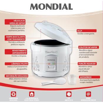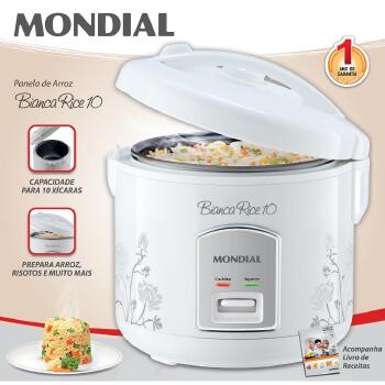 Itens Incluso: 1 Panela Elétrica Mondial Bianca Rice PE-10 com Função Aquecer - 2 L 1 Espátula Copo medidor Manual de instruções com Receitas Manual de Assitência Técnica