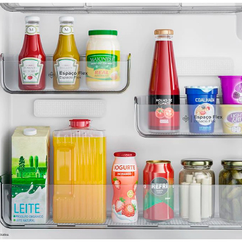Prateleiras do refrigerador em vidro com moldura plástica. prateleiras de porta. gavetas e cestos em plástico injetado.
