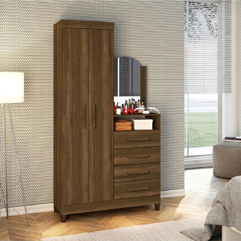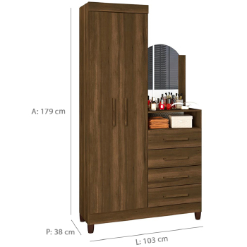Esse produto possui design moderno, conta com 4 gavetas e 2 portas com puxadores em MDF revestidos. Traz um excelente espaço interno com cabideiro e prateleira. Possui espelho e tampo para acomodar cosméticos e itens de beleza.