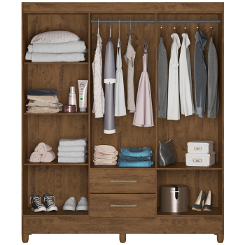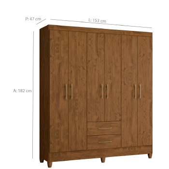 O guarda-roupa Panamá é feito em MDP, possui 6 portas e 2 gavetas com corrediças metálicas. Tem cabideiro e um amplo espaço interno com espaço bem dividido entre as prateleiras.