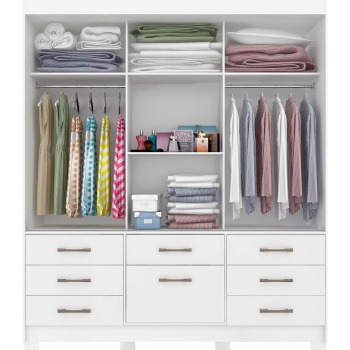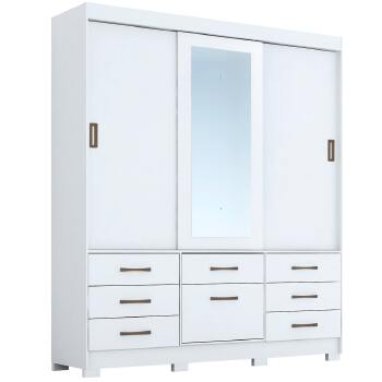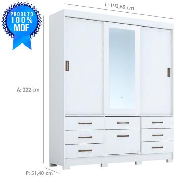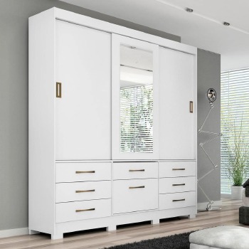 Guarda-roupas Luíza 3 portas e 7 gavetas da Panan. 100% MDF Corrediças telescópicas 03 portas de correr, espelho e uma divisão interna encantadora 07 gavetas grandes com puxadores que conferem um designe diferenciado Cabideiros e suportes em aluminio, garantem maior resistência e mais peças de roupas 03 Maleiros, muito mais espaço para acomodar malas, colchas ou bolsas Kit pés que conferem a beleza e facilitam a beleza