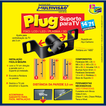 Descrição Feito do mesmo material utilizado na indústria aeronáutica, esse Suporte Multivisão para TV Plasma, Led e LCD vem pronto para instalar. Ajuste FINO PARA Centralização Da Tv. Dimensões do produto: Altura: 2,5 cm Largura: 11,5 cm Profundidade: 2,5 cm Peso líquido: 0,310 kg Dimensões do produto embalado: Altura: 8 cm Largura: 23 cm Profundidade: 16 cm Peso bruto: 0,330 kg Garantia do fornecedor de 12 meses