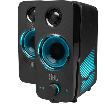 Suba de nível com os poderosos alto-falantes para jogos em PC JBL Quantum Duo. Aprofundese na ação com som perfeito e efeitos de iluminação exclusivos. Identifique com facilidade os tiros recebidos, ouça os inimigos se aproximando e sinta o barulho da ação explosiva. Com o som surround proprietário da JBL e Dolby Digital para jogos em um design diferenciado e atraente. Nunca perca um passo, tiro ou salto com amplificadores e tweeters expostos para uma nitidez de som incrível. Com as diferentes predefinições de cores e padrões de iluminação para personalizar sua configuração, os jogos nunca foram tão reais.