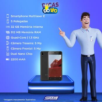 CONTEÚDO DA EMBALAGEM: 1 smartphone Multilaser E, 1 capa de silicone, 1 película protetora de tela, 1 guia rápido.