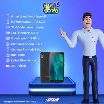 CONTEÚDO DA EMBALAGEM: 1 Smartphone Multilaser F, 1 capa de silicone, 1 película protetora de tela, 1 guia rápido