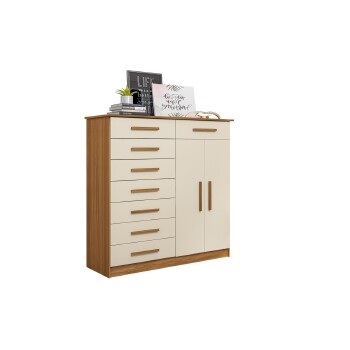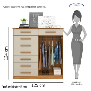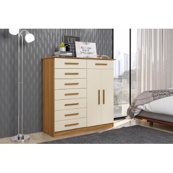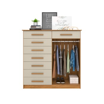 Produto compacto com 08 gavetas, 02 portas de bater e cabideiro, puxadores em MDF revestidos. Ideal para ambientes reduzidos.