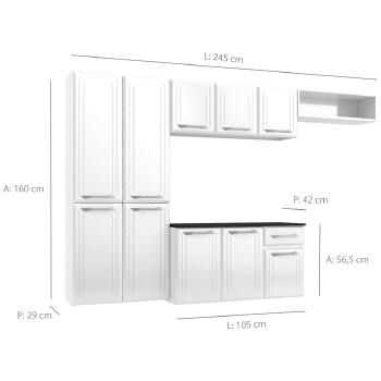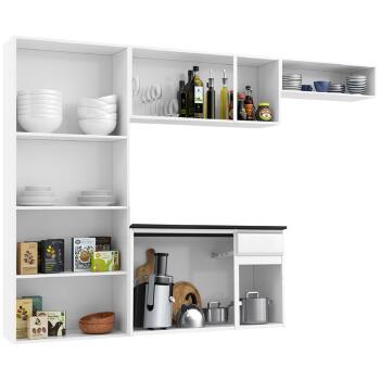 Com o armário, o paneleiro e o balcão você tem espaço suficiente para guardar panelas, louças e alimentos. O balcão possui ainda uma gaveta, fabricada em polipropileno, plástico rígido e resistente, que tem capacidade para suportar até 5kg.