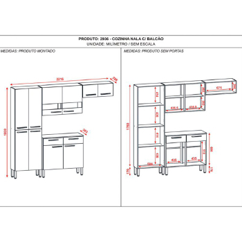 A Cozinha Nala é produzida com madeira reconstituída provinda de reservas florestais para este fim. Possui oito portas sendo uma com vidro reflecta que destaca a peça em seu ambiente, Os puxadores são ergonômicos em plástico resistente (poliestireno) com acabamento metalizado, mais beleza para sua cozinha. Oito pés reguláveis em plástico resistente (polipropileno) garantem a estabilidade do produto, podendo-se fazer pequenes ajustes na montagem, para o produto se adequar em pisos irregulares. O espaço interno é bem dividido com a utilização de prateleiras, para melhor organizar dos utensílios da cozinha. Todos os processos com secagem em luzes UV deixando o móvel mais bonito trazendo modernidade a sua cozinha.
