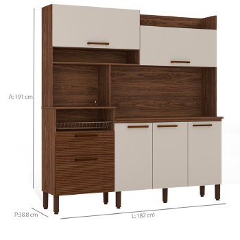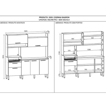 A Cozinha Sauron é produzida com madeira reconstituída provinda de reservas florestais para este fim. Possui oito portas sendo uma com vidro reflecta que destaca a peça em seu ambiente, Os puxadores são ergonômicos em plástico resistente (poliestireno) com acabamento metalizado, mais beleza para sua cozinha. sete pés reguláveis em plástico resistente (polipropileno) garantem a estabilidade do produto, podendo-se fazer pequenes ajustes na montagem, para o produto se adequar em pisos irregulares. O espaço interno é bem dividido com a utilização de prateleiras, para melhor organizar dos utensílios da cozinha. Todos os processos com secagem em luzes UV deixando o móvel mais bonito trazendo modernidade a sua cozinha.