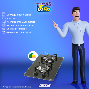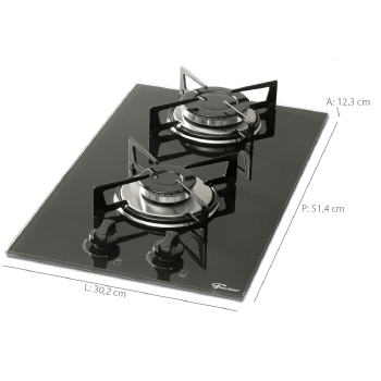 Descrição O Cooktop 2 Bocas Fischer tem botão de acendimento ergonômico e mesas em vidro temperado, mais modernas, bonitas e fáceis de limpar. Apresenta um sistema de leds que indica temperaturas iguais ou superiores a 50ordm;C, garantindo maior segurança no manuseio. Os queimadores SABAF a gás têm alto rendimento e são fornecidos exclusivamente à Fischer. Vidro temperado preto ébano: 2 queimadores, sendo: 1 queimador rápido (3000W) 1 queimador semirrápido (1750W) Acendimento super automático Trempe individual Tipo de Gás: GLP Modelo 7726-11474 Tensão 127V - 220V (Bivolt) Potência (sistema elétrico - máximo) P=2,2W - 2,5W Consumo (Total) 0,3455kg/h Corrente 0,02A (127V) / 0,01A (220V) Acendimento: Super automático Pressão do Gás: 28 a 37 mBar (GLP) Cor / Acabamento: Preto Ébano Obs.: este fogão não pode ser instalado em base de madeira. Dimensões: Altura: 47 cm Largura: 30,2 cm Profundidade: 55 cm Peso: 5,18 kg Garantia do fornecedor de 03 meses.