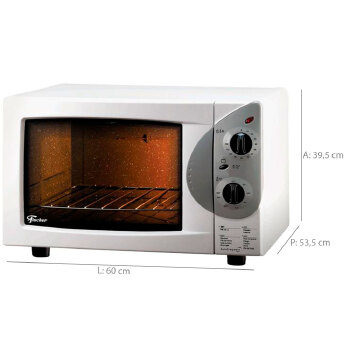 Descrição Um dos Fornos mais vendidos da categoria, o Forno Elétrico 44 Litros Fischer Grill Autolimpante tem design arrojado e inovador, com frontal em termoplástico branco, abertura ergonômica e corpo interno autolimpante. Traz também dourador, luz interna, timer de 0 a 2 horas e termostato para assar, dourar, tostar e gratinar os alimentos, deixando-os muito mais saborosos e apetitosos. Características: Timer 0 a 2 horas com aviso sonoro. Dourador. Luz interna. Luz piloto ( indica quando o forno está ligado ). Controle automático de temperatura. Abertura ergonômica. Frontal em termoplástico. Grade cromada removível e ajustável ( 2 alturas ). Bandeja esmaltada para resíduos. Corpo interno autolimpante. Corpo externo pintado branco. Termostato de 50deg;C a 320deg;C. Isolamento em fibra cerâmica. Pés antiderrapantes. Informações técnicas Modelo 1323-5697 ( 127v ) / 1323-5684 ( 220v ). Tensão 127v / 220v ( não é bivolt ). Potência 1750W. Volume Interno ( Litros ) 44 L. Consumo ( Bolo inglês ) 0,60kWh. Corrente 13,8A ( 127V ) / 7,95A ( 220V ). Lâmpada 1 x 15W. Controle: Eletromecânico. Volume Unitário do Produto Embalado 0,126msup3;. Dimensões Produto: Altura: 36 cm Largura: 57,7 cm Profundidade: 49,0 cm Peso: 14,47 kg Dimensões do produto embalado: Altura: 39,5 cm Largura: 60 cm Profundidade: 53,5 cm Peso bruto: 14,82 kg Garantia do Fornecedor de 12 meses.