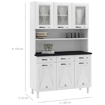 Descrição Kit Cozinha 3 Portas Vidro 3 Gavetas Telasul Star, para sua cozinha ficar muito mais aconchegante! Características: Pintura eletrostática a pó, mais resistência e durabilidade ao produto Puxadores em acrílico, mais beleza ao produto Pés reguláveis, se adaptam a qualquer piso Gavetas plásticas com corrediças metálicas, fáceis de limpar e resistência de peso de até 5 kg Vidros temperados e serigrafados, mais segurança e beleza ao produto Produto ideal para ambientes de espaço reduzido ou até mesmo como complemento da sua cozinha Dimensões Aproximadas do Produto: Altura: 193cm Largura: 120cm Profundidade: 52cm Peso: 50,7Kg Garantia do Fornecedor de 12 meses