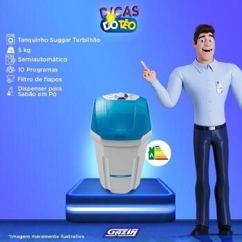 Descrição A Lavadora de Roupas 5kg Turbilhão da Suggar lava até 5kg com a função reaproveitar água. Tem dispenser para sabão, além de filtro cata-fiapos e 2 níveis de água. Possui 2 molhos e desligamento automático com timer com programação de 0 a 20 min. São 10 programas de lavagem com um batedor eficiente para deixar suas roupas limpas com todo cuidado que merecem.