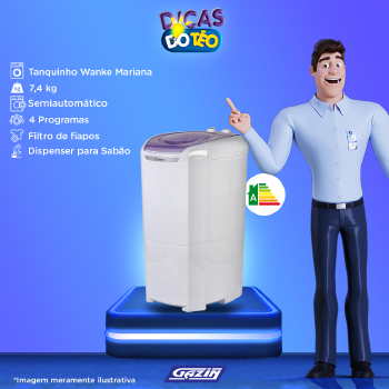 Descrição Lavadora 7,4Kg Wanke Mariana, oferece a você praticidade, eficiência! Características: Lavagem por turbilhonamento. Timer com 3 programas de lavagem. Retentor de fiapos. Retentor de objetos, Saída de água por gravidade Dispenser para sabão em pó, líquido e amaciante com medidor no dispenser. Lava Edredon de solteiro e de casal. Menor consumo de água da categoria Transbordo direcionado Fixação da Mangueira no Tanque Fixação do Cabo do Alimentação no tanque