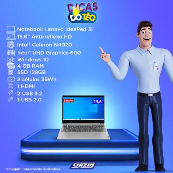 Lenovo IdeaPad 3i possui design leve e compacto. Com tela antirreflexo de 15.6" para mais conforto visual. Notebook ideal para todos os momentos. Conta com WiFi AC ultrarrápido e teclado numérico para trabalhar com mais agilidade nas suas planilhas. O armanezamento SSD PCIe é 10x mais rápido* que um HDD 2.5? SATA, você terá mais segurança ao armazenar seus dados. Nitidez e alta qualidade de som com certificação Dolby Audio. Sua privacidade pessoal é muito importante. É por isso que o IdeaPad 3i está equipado com porta de privacidade da webcam. Quando não estiver em uma chamada de vídeo ou gravando algo, basta deslizá-la. Faça vídeo-conferências em alta-definição com a câmera HD-720p.