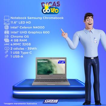 O Samsung Chromebook é a opção ideal para quem está sempre conectado. Basta logar sua conta Google no aparelho e pronto, você tem seu perfil e arquivos disponíveis de onde estiver. Além disso, o Chromebook é super fino, leve, e liga em menos de 10 segundos. Leveza e praticidade ao seu alcance.