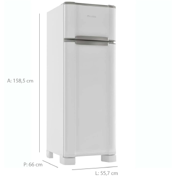 São 276 Litros da capacidade total, refrigerador com 2 portas, freezer de 55L, puxadores ergonômicos, gaveta de legumes e prateleiras na porta removíveis, reguláveis e inclináveis, iluminação na lateral do refrigerador, gaxeta Push In, pés elevados com niveladores, classificação A em eficiência energética