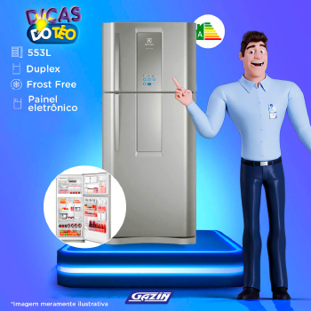 Descrição Refrigerador com super capacidade 132 litros de capacidade no freezer e 421 litros no Refrigerador para armazenar tudo que for preciso sem esforço. Painel Blue Touch Tecnologia Touch On Control, sem botões aparentes, para executar as funções eletrônicas do seu Refrigerador. Prateleira retrátil no freezer Pode ser utilizada em 3 posições: prateleira interna, meia prateleira e totalmente retraída, com amplo espaço. Ice Twister Com função Ice Express e Ice Stock, são 3 formas que facilitam a remoção e acelera a produção do gelo a qualquer hora de forma prática e simples. Características: Frosty Cups Taças e copos sempre gelados para comemorar até as inesperadas celebrações. Drink Express Resfria garrafas e latas de bebidas rapidamente quando acionado pelo painel. Auto Control Seleciona com apenas um toque os modos de funcionamento Compras, Férias e Festas. Turbo congelamento Resfria e congela rápido ajudando a conservar melhor os alimentos. Porta-ovos - 12 unidades Organização e segurança para armazenar os ovos. Gavetão transparente com controle de umidade Amplo espaço para armazenar frutas e legumes proporcionando melhor organização e visualização dos alimentos. Prateleira de vidro temperado Bonitas, resistentes e fáceis de limpar. Sistema Multiflow Distribui o ar no interior do Refrigerador garantindo a melhor preservação dos alimentos. Prateleira funda na porta Ideal para garrafas de até 3,3 litros e trava garrafas aproveitável Especificações Técnicas: Capacidade bruta de armazenamento (L) Refrigerador: 431 Freezer: 137 Total: 568 Capacidade líquida de armazenamento (L) Refrigerador: 421 Freezer: 132 Total: 553 Tensão (V): 127/220 Frequência (Hz): 60 Consumo Classificação energética: A 127V - 60Hz: 71 220V - 60Hz: 71 Dimensões: Altura: 191.5cm Largura: 80cm Profundidade: 75cm Peso: 10.5kg Garantia do fornecedor de 12 Meses