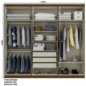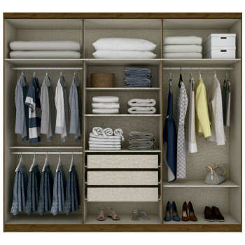 Possui amplo espaço interno e design inovador e diferenciado, espaço para roupas longas e maleiro interno, além de 3 gavetas internas.